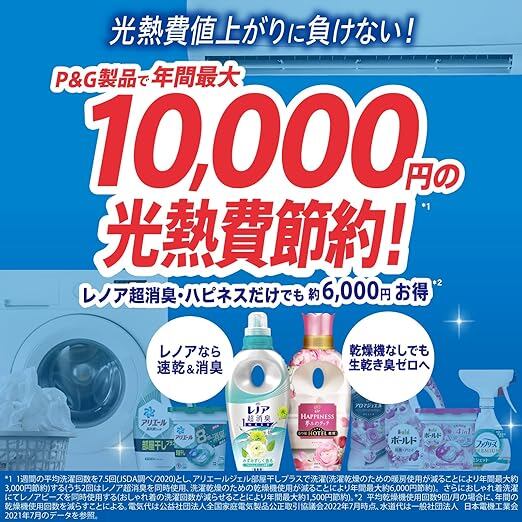 レノア超消臭1WEEKは、1週間ずーっと続く消臭力*1。 かけっぱなしの洗面所のタオルや、ニオイが気になるけれど毎日は洗えない、シーツや枕カバーまで、1週間ずーっと爽やか*1。 *1 保管状態で