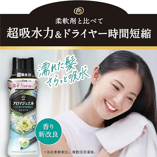 アロマジュエルなら柔軟剤に比べて超吸水*。バスタオルやハンドタオルを6回使っても吸水力&香り続く! (*当社柔軟剤比。複数回洗濯後。)