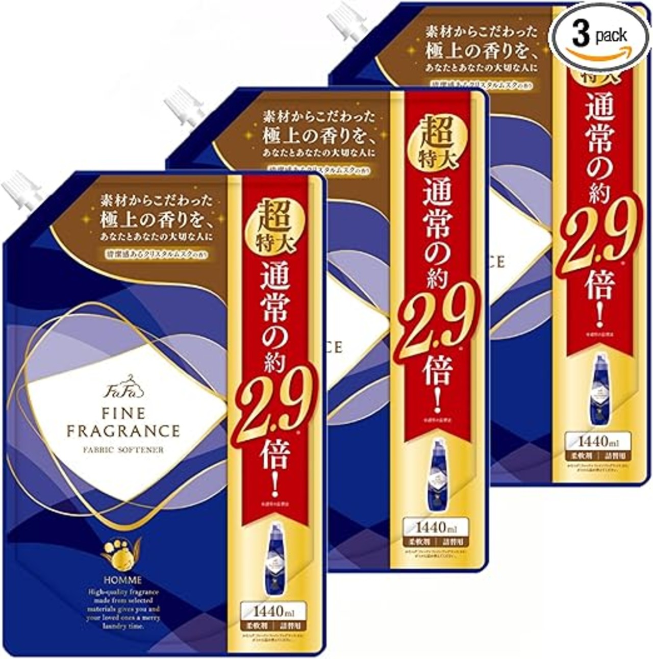 【まとめ買い】ファーファ ファインフレグランス 柔軟剤 オム 香水調 クリスタルムスクの香り 超特大容量 詰替 1440ml×3個1