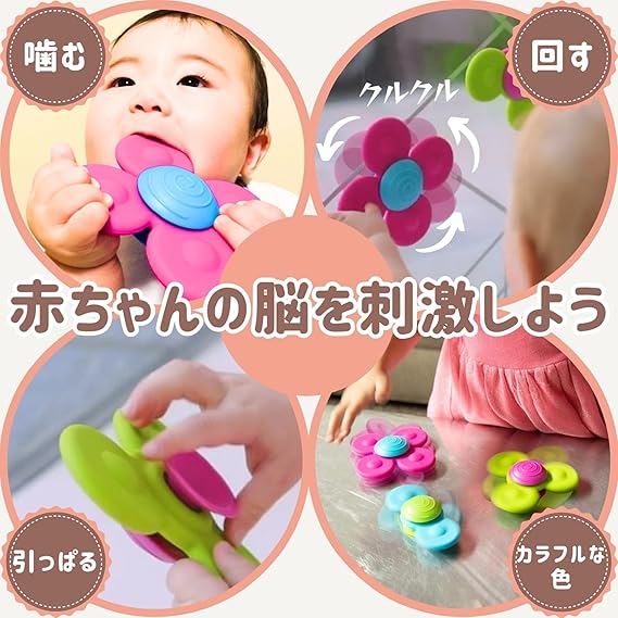 アメリカ発 知育玩具メーカーFat Brain Toys (ファットブレイントイズ) 社の赤ちゃんおもちゃ Whirly Squigz (ワーリースクイグズ)。吸盤でくっつけてクルクル回して遊べるカラフルなベビートイです。