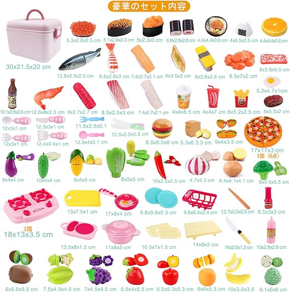 【超豪華、大量セット】計76点:このセットには寿司、野菜、果物、ピザ、魚、エビ、カニ、ハンバーグ、洋食、キッチン用具などいろいろあります。写真通りで色々な種類のおもちゃが入ってました!何より包丁3本も入ってますので、子供達もケンカすることなく、仲良く遊べています。プラスチック製でとても軽くて。加えて、マジックテープ式、切る手応えの良い。1個プラスチック収納箱(高品質、片付けもしやすいです、遊びや整理がより簡単になる)。