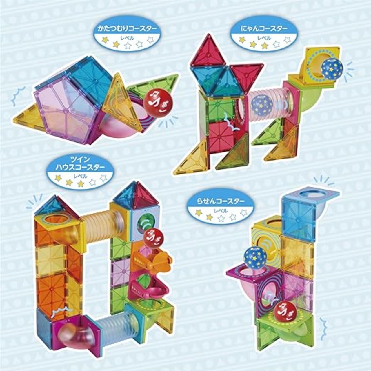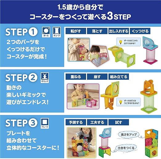 パーツたっぷりで作れるコースターは創造力次第で無限大。年齢に合わせて長く遊べます。