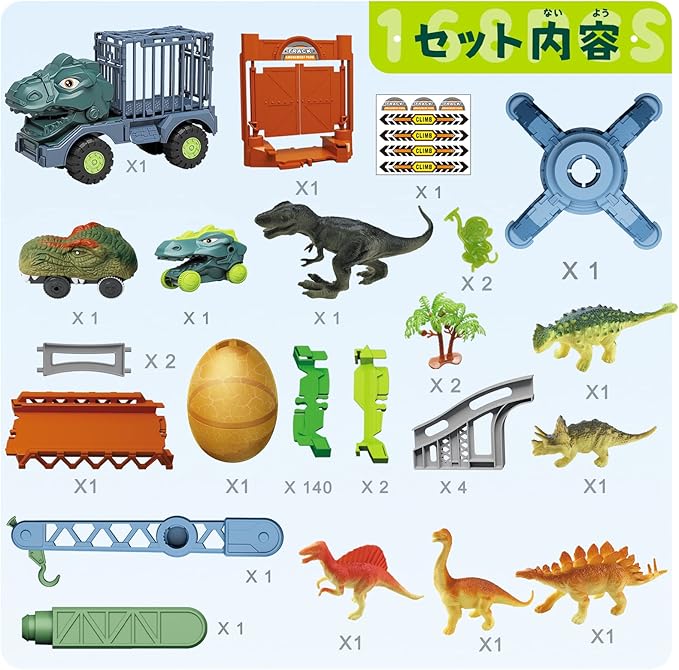 【豪華な168点セット】セットには恐竜トラック*1、電動恐竜カー*1、慣性恐竜カー*1、恐竜フィギュア*6、 恐竜の卵*1、ステッカー*1、サル型の飾り物*2、木*2、翼竜の門*1、グレーン関連部品*3、レール関連部 品*149など合計168点が含まれ、恐竜の冒険を始めましょう。