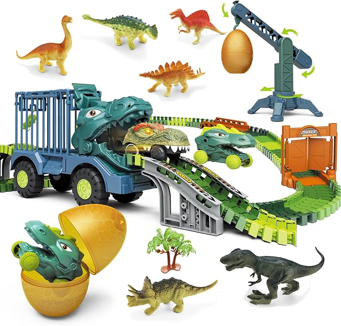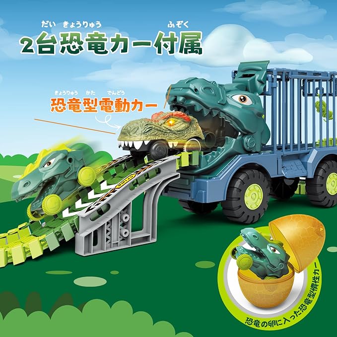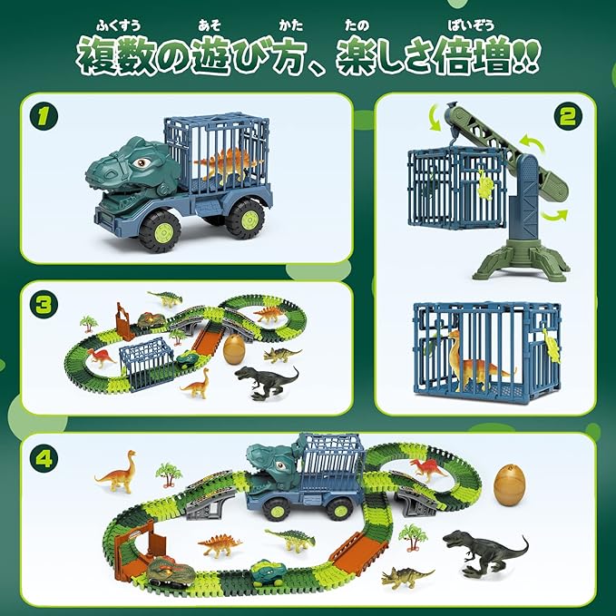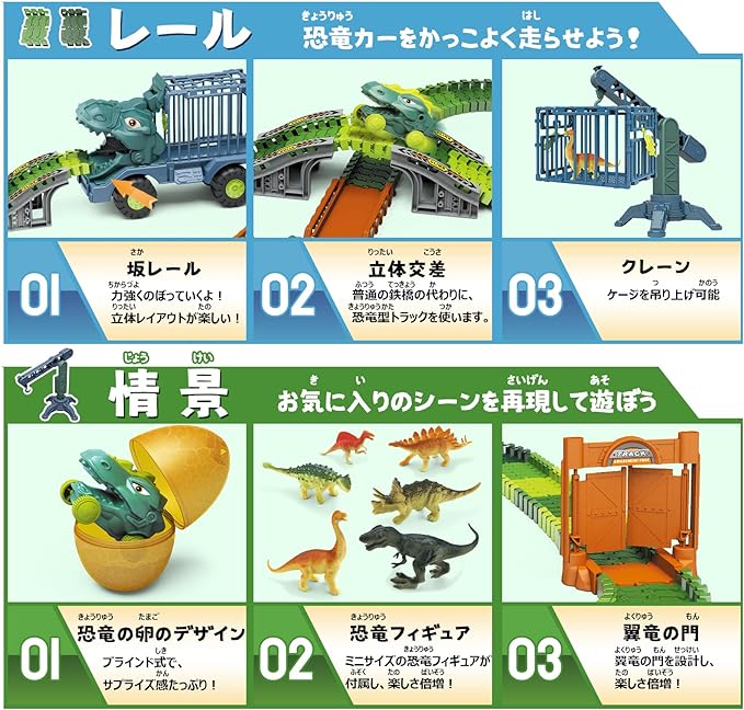 【ユニックなデザイン】恐竜をモチーフとしたトラック式鉄道玩具で、電動恐竜カー、慣性機能付きの恐竜カー、 迫力満点の恐竜などが揃っており、本物のようにリアルさがバッチです。更に、慣性機能付きトラックは単体でも 遊べ、付属のクレーンはケージと恐竜の卵を吊られ、楽しさが倍増され、何時間も楽しめます。