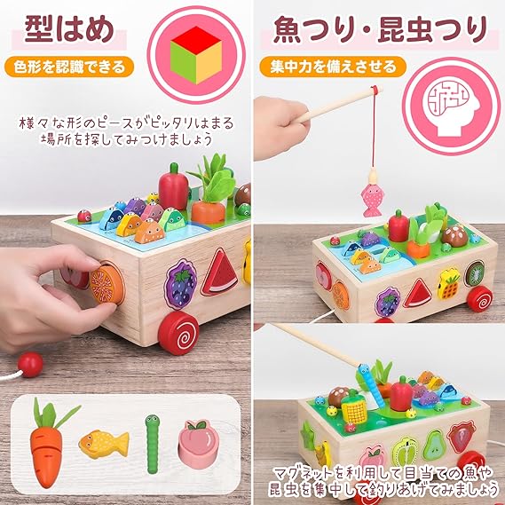 【多機能で長く遊べる】このモンテッソーリ知育おもちゃは、型はめ、魚釣り、昆虫つり、野菜収穫、おままごと、糸通し、車でのおでかけの7種類の遊びが楽しめます。車の中におもちゃを収納できるので、片付けも簡単。木製の温かみとカラフルなデザインで、インテリアとしても魅力的です。