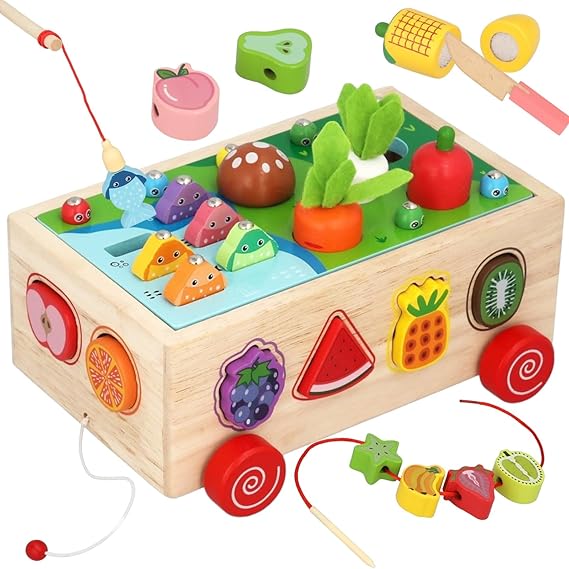 多機能モンテッソーリ知育玩具 - 木製型はめ・魚釣り・紐通し・おままごとセット | カラフルで片付け簡単 | 安全素材使用 | popoma1