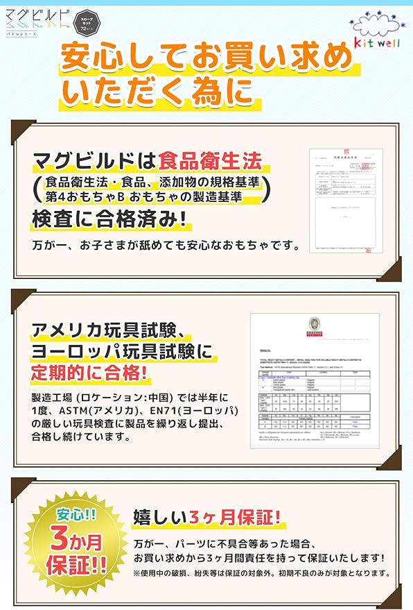 安全性が評価され、人気ランキング急上昇!保育園、幼稚園、幼児教室、キッズ スペースへの納入も多数あり、お誕生日、入園祝い、入学祝い、クリスマスなどの プレゼント、ギフト、贈り物に選ばれています!万が一、口に入れても安心のABS素材を使用した磁石おもちゃ。日本の食品検査に合格しています。ひらめきの力を育む知育玩具です!