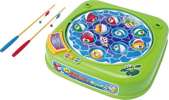 <あそび方> 1.本体の円盤の穴に魚をセットしてください。 2.本体のスイッチをONの位置にスライドさせると、円盤が回転して魚が口をパクパク開きます。 3.釣竿で魚を釣りあげて、たくさん釣った人が勝ちです。