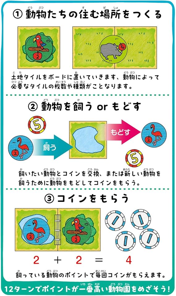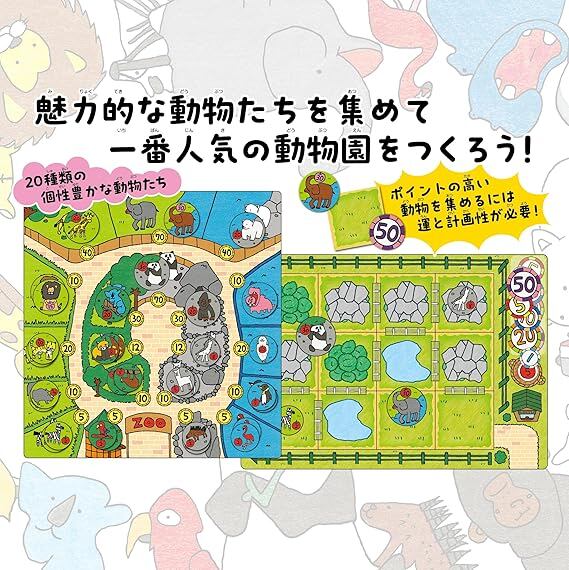 誰よりも魅力的な動物園を作る"拡大再生産型"ボードゲーム。土地パネルでボードを開拓し、地形に合わせて飼う動物を選んで、一番ポイントの高い動物園を作りあげましょう。いかに人気の動物を集めて動物園の魅力を高めるかがポイントです。大人も子供も一緒に、じっくり楽しめる本格ボードゲームです。