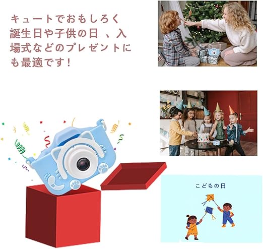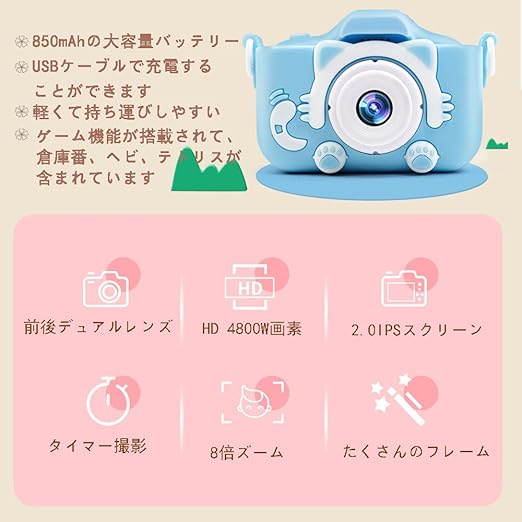 デジカメ 子供 かわいい こども カメラ 前後4800万画素 1080P HD 操作簡単 キッズカメラ 32GBメモリーカード付き 2.0インチIPS画面 8倍ズーム 耐衝撃 子供 カメラ 猫 軽量 持ち運び便利 850mAh USB充電 デュアルレンズ 自撮り機能 タイマー撮影 多機能 音楽 ゲーム機能 知育おもちゃ 女の子 男の子 子供の日 お誕生日プレゼント お正月プレゼント 日本語取扱説明書付き (青い)1