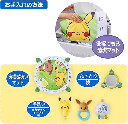 【大人気のモンポケシリーズから洗えるベビージムが登場! 】3つの成長に合わせた遊びができるベビージム。ピカチュウ達のラトルを使って指遊びをし、脳を刺激させましょう。マットには1から12の数字が書かれています。そのため、イーブイのラトルのリングで数字を囲って記念日写真が撮れます。お子さまの成長記念になること間違いなし!