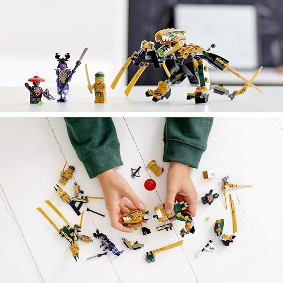 中にスタッドシューターが隠された開閉する口とポーズが変えられる翼や脚、尻尾がついたゴールデン・ドラゴンを組み立てて、『ニンジャゴー ~スピン術バトルの使い手~』のゴールデン・ニンジャのロイドとオーバー卿との最後の戦いを再現しよう!