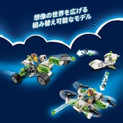 組み立てと組み替えが自由自在 ? 車輪が回転し、どんなデコボコ道もへっちゃらなバギーか、パワフルなリアエンジンが付いたマルチコプターを組み立てられます
