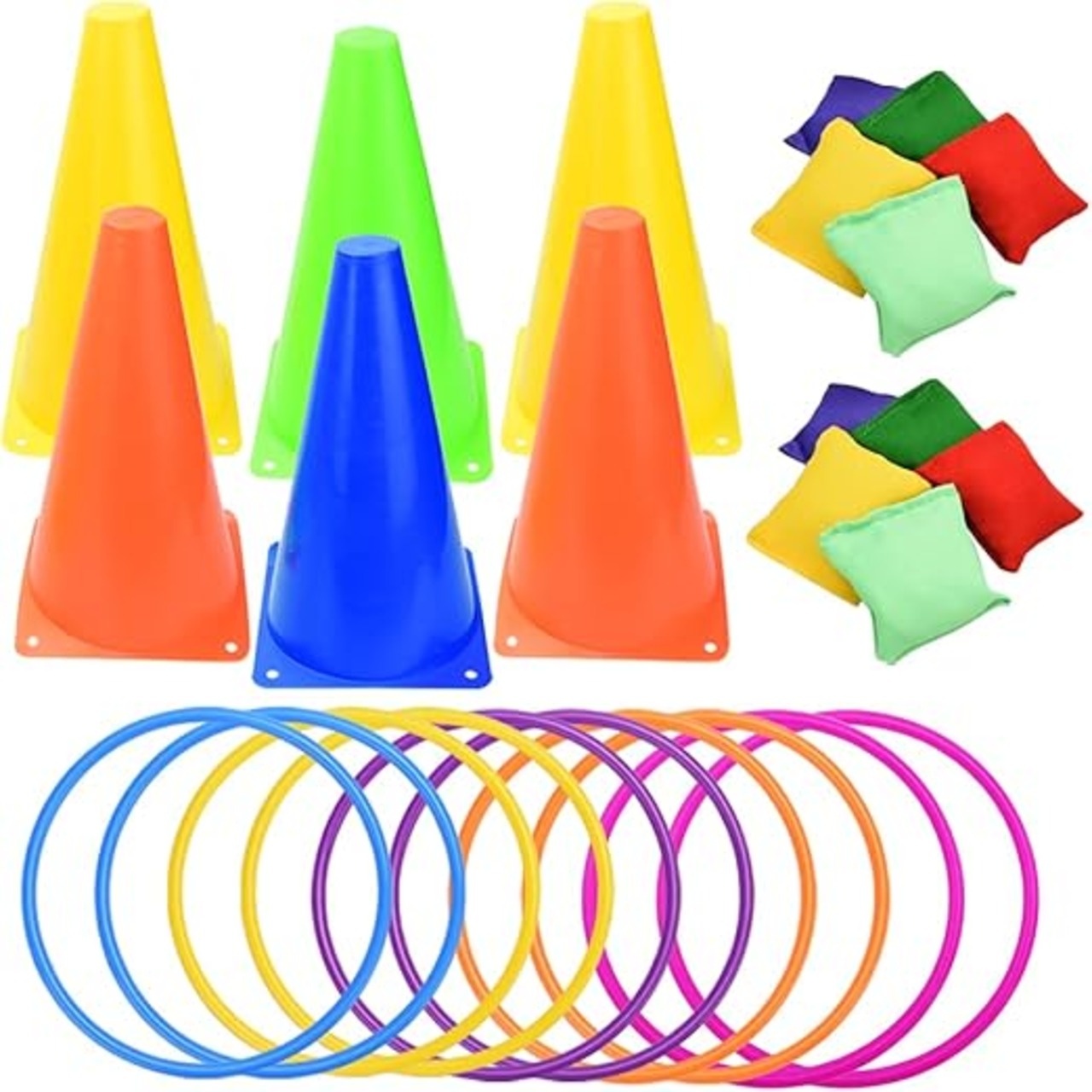【セット内容】ソフトプラスチックコーン×6個 プラスチックカラーリング×10個 ビーンバッグ10個 【サイズ(約)】ソフトプラスチックコーン:16cm×13.5cm プラスチックカラーリング:直径23cm ビーンバッグ:5cm×5cm