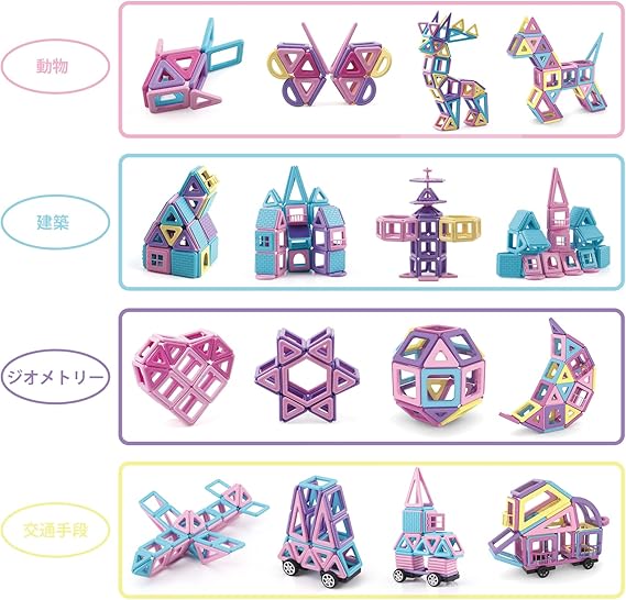 【保護者の方へご注意ください】 小さな部品があります。誤飲、窒息などの危険がありますので、6歳未満のお子様には絶対に与えないでください。必ず保護者のもとで遊ばせてください。磁石を飲み込んでしまった場合、腸全体に粘着し、重度の感染症や死亡を引き起こします。磁石を飲み込んだり、吸い込んだりした場合は、すぐに医師の診察を受けてください。ご注意:ブロックの色はランダムです、形と数を参考してください。色が気になる方は慎重に選んでください。この商品には小さな磁石が含まれています。