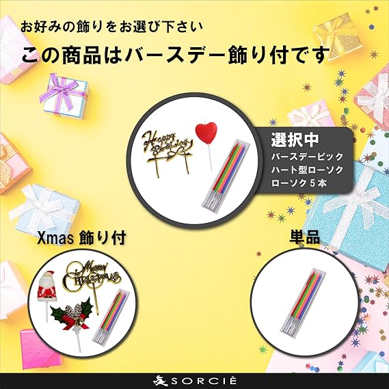 【バースデー飾り付き】金色のバースデーピック、ハート型ローソク、ローソク5本付きで、お誕生日をもっと華やかに。