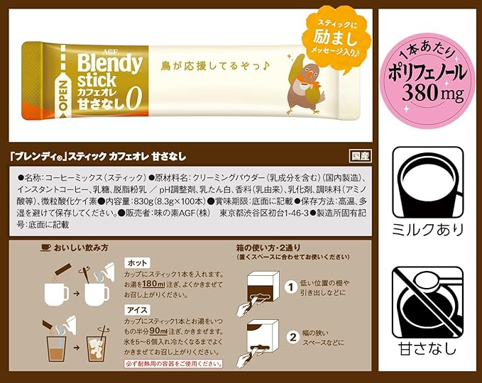 AGF ブレンディ スティック カフェオレ 甘さなし 100本 【 スティックコーヒー 】【 無糖 】1
