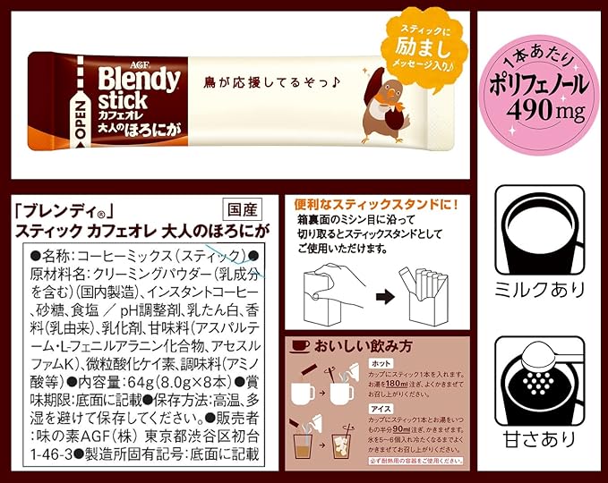 AGF ブレンディスティック カフェオレ 大人のほろにが 8本 ×6箱 【 スティックコーヒー 】 【 粉末 】1