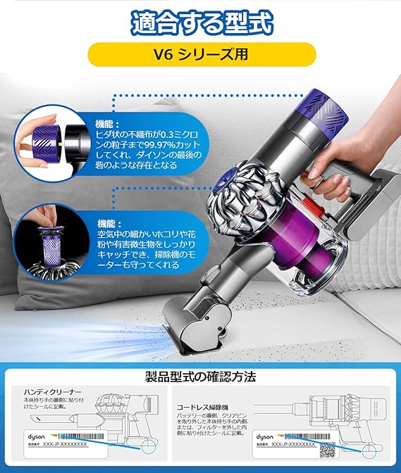 ??【対応機種】 V6 シリーズ用 ⇒【SV09】: V6 Fluffy+ ( SV09 MH COM ) 、 V6 Fluffy ( SV09 MH ) 、 V6 Fluffypro ( SV09 MH PRO ) 、 【SV07】: V6 Motorhead+ ( SV07 MH COM ) 、 V6 Motorhead ( SV07 MH )、【HH08】: V6 Mattress 、 V6 Mattress+ 、 V6 Trigger 、 V6 Trigger Pro 、 V6 Trigg