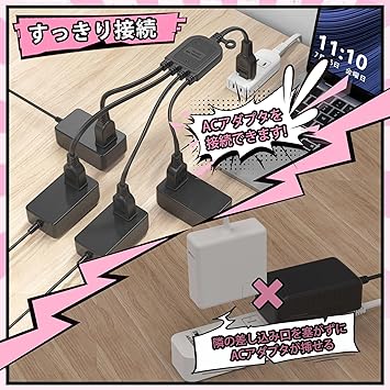 ?ACアダプタを無駄なく設置できる4分岐タイプの電源延長コードです。