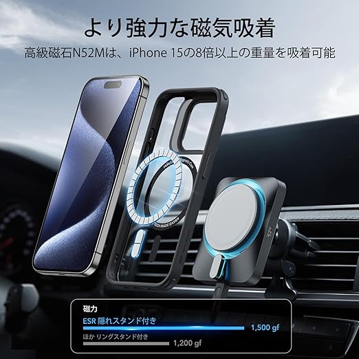 【高級磁石N5M付き・強力吸着】ESR iPhone 5 Pro 用 ケースは,500 gの吸着力を持つ強力な内蔵磁石により、iPhone 5の8倍以上の重量を吸着可能です。車運転中の激しい振動でもMagsafe車載ホルダーから外れることなく、0000mAhのモバイルバッテリーを付けでも落としません。