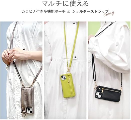 カードやリップなどが入る便利なポーチ付き!ポーチはスタンドとしても使用可能。ショルダーストラップは長さ調整が可能。