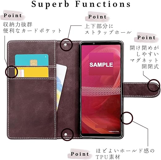 ストラップ穴付きのため、チェーンを付けたりストラップを付けることが可能となります。手帳の素材は合皮 PUレザーとなります。電源ボタン・音量ボタン等はケースの上から押す仕様となります。