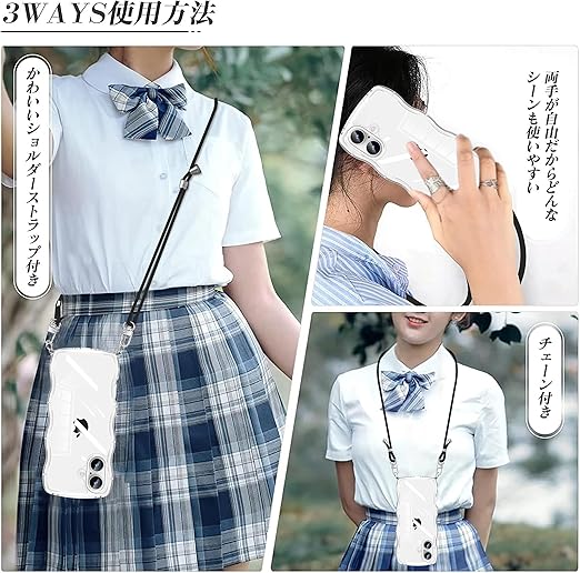iPhone 16 用 ケース クリア ショルダー ストラップ付き アイフォン 16 用 カバー かわいい 波状フレーム 人気 韓国 耐衝撃 透明 iPhone16 用 スマホケース 首かけ 肩掛け 薄型 軽量 QIワイヤレス充電対応(透明)1