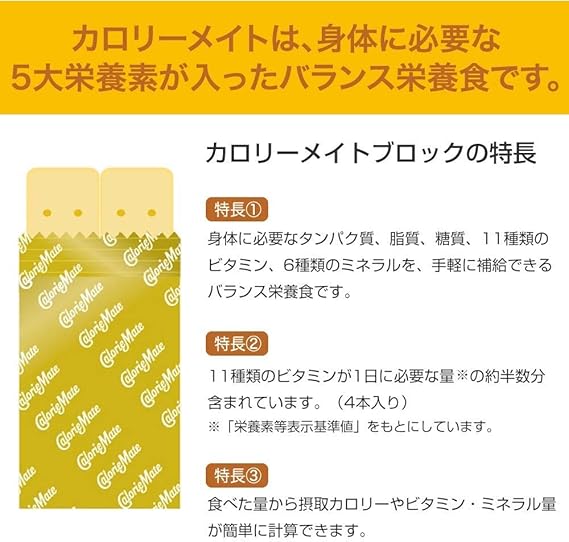 原材料:【カロリーメイト ブロックフルーツ】小麦粉(国内製造)、マーガリン、砂糖、卵、レモンピール加工品、アーモンド、グレープフルーツパウダー、脱脂粉乳、大豆タンパク、小麦タンパク、でん粉、食塩/カゼインナトリウム、加工でん粉、香料、ナリンジン、カロチノイド色素【カロリーメイトブロック チョコレート】小麦粉(国内製造)、チョコレートスプレッド、砂糖、卵、アーモンド、脱脂粉乳、大豆タンパク、小麦タンパク、食塩、でん粉/カゼインナトリウム、