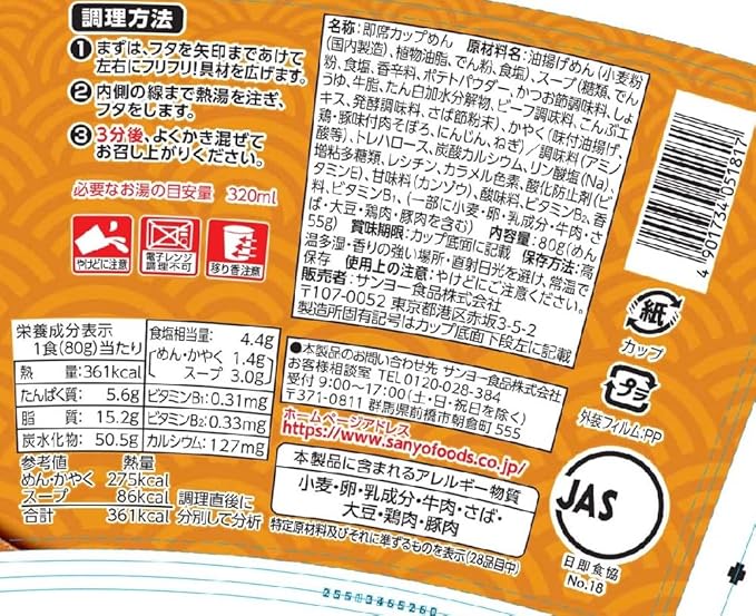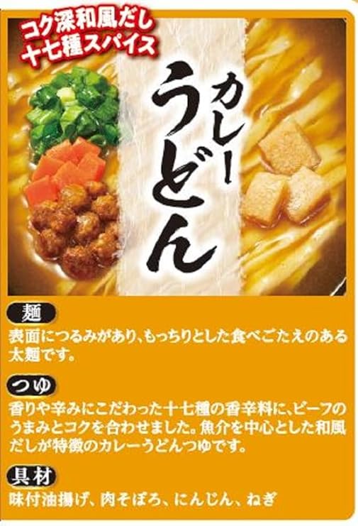 原材料名:油揚げめん(小麦粉(国内製造)、植物油脂、でん粉、食塩)、スープ(糖類、でん粉、食塩、香辛料、ポテトパウダー、かつお節調味料、しょうゆ、牛脂、たん白加水分解物、ビーフ調味料、こんぶエキス、発酵調味料、さば節粉末)、かやく(味付油揚げ、鶏・豚味付肉そぼろ、にんじん、ねぎ)/調味料(アミノ酸等)、トレハロース、炭酸カルシウム、リン酸塩(Na)、増粘多糖類、レシチン、カラメル色素、酸化防止剤(ビタミンE)、甘味料(カンゾウ)、酸味料、ビタミンB2、香料、ビタミンB1、(一部に小麦・卵・乳成分