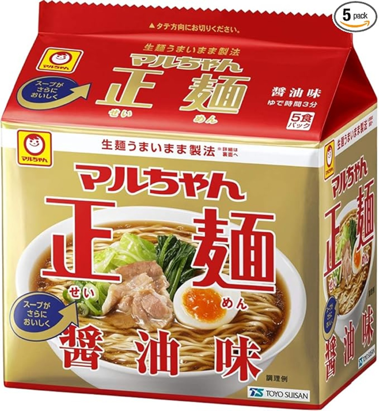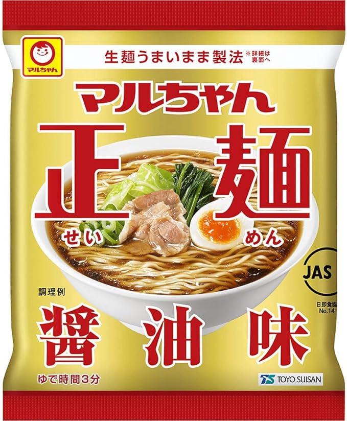 原材料:めん(小麦粉、食塩、植物油脂、卵白)、添付調味料(醤油、チキンエキス、食塩、植物油、鶏脂、ポークエキス、砂糖、香辛料、野菜エキス、発酵調味料、たん白加水分解物、酵母エキス、香味油脂)、加工でん粉、調味料(アミノ酸等)、トレハロース、かんすい、酒精、炭酸カルシウム、レシチン、カラメル色素、香料、酸化防止剤(ビタミンE)、香辛料抽出物、クチナシ色素、増粘多糖類、甘味料(カンゾウ)、(原材料の一部に乳成分、ゼラチンを含む)