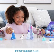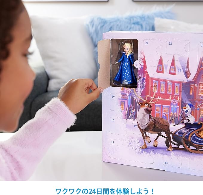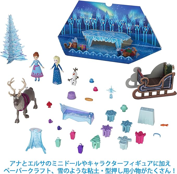 【内容】クリスマスイブまで毎日楽しい!ディズニー映画『アナと雪の女王』、短編映画『アナと雪の女王/家族の思い出』をイメージしたアドベントカレンダーです。12月1日から24日まで毎日1つずつ小窓をあけて、エルサやアナ、なかまたちのフィギュアや小物を集めよう!エルサ、アナのミニドールが1体ずつ、オラフやスヴェン、ソファやテーブルなどの家具に、パンやケーキなどのたべもの、エルサのマントなどのアクセサリーがついています。雪をイメージした砂状の粘土もついているので、自由自在に形を作って、素敵にディスプレイ