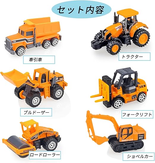【車 おもちゃ&建設車両 】フォークリフト、ロードローラー、ブルドーザー、ショベルカー、トラクター、牽引車など男の子が大好きな6点セットはたらくくるまです。豊富なミニカーセットで建設現場を再現し、楽しく遊べます!