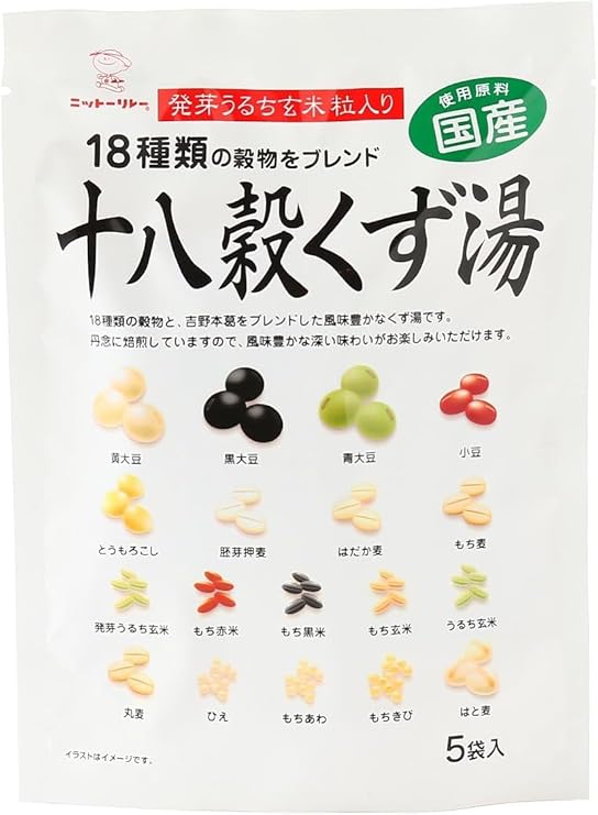 原材料:砂糖(国内製造)、雑穀粉末(はだか麦、うるち玄米、発芽うるち玄米、丸麦、胚芽押麦、もち玄米、もち麦、もち黒米、青大豆、もちきび、はと麦、もち赤米、もちあわ、黄大豆、黒大豆、小豆、ひえ、とうもろこし)、でん粉、発芽うるち玄米、本葛