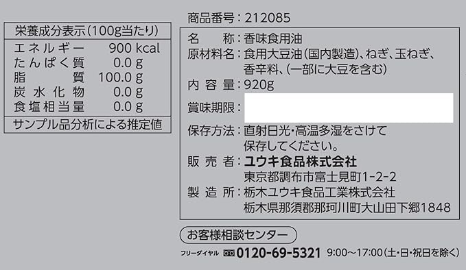 原材料: 食用大豆油(国内製造)、ねぎ、玉ねぎ、香辛料、(一部に大豆を含む)