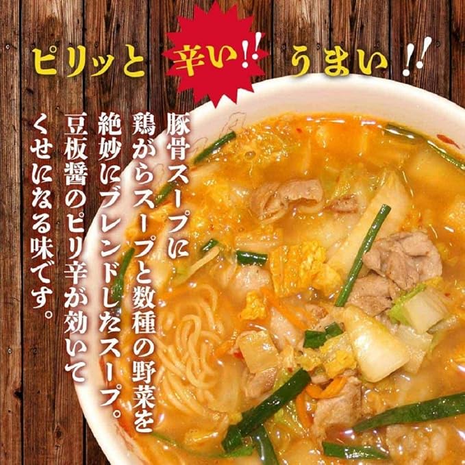 原材料:(麺)小麦粉、小麦たん白、還元水飴、食塩、加工澱粉、酒精、かんすい、クチナシ色素(ス-プ)ポークエキス、醤油、ポークペースト、チキンエキス、食塩、香辛料、豆板醤、ラード、還元水飴、酵母エキス、酒精、調味料(アミノ酸等)、増粘剤(加工澱粉)、増粘多糖類(調味油)ラード、豚背脂、ラー油、酸化防止剤(V、E)、(原材料の一部に小麦、大豆、鶏肉、豚肉を含む)