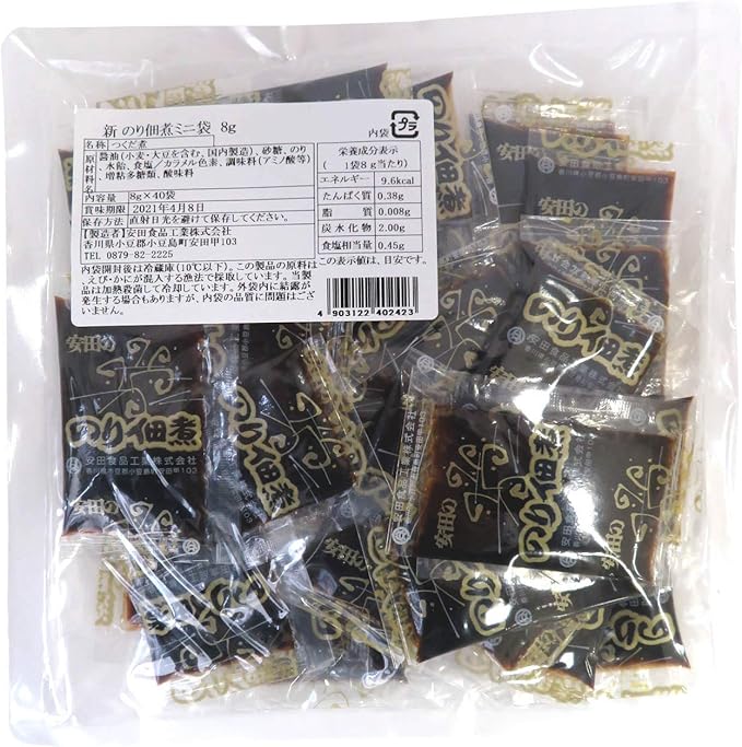 原材料:醤油(小麦・大豆を含む、国内製造)、砂糖、のり、水飴、食塩/カラメル色素、調味料(アミノ酸等)、増粘多糖類、酸味料