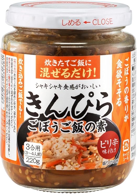 原材料:野菜(ごぼう、にんじん)、砂糖、しょうゆ(小麦・大豆を含む)、食塩、ごま、植物油脂(大豆を含む)、みりん、唐辛子、鶏肉風味調味液(大豆・鶏肉を含む)、かつお節風味調味料(乳成分・大豆・鶏肉を含む)/調味料(アミノ酸等)、乳酸Ca,調味料