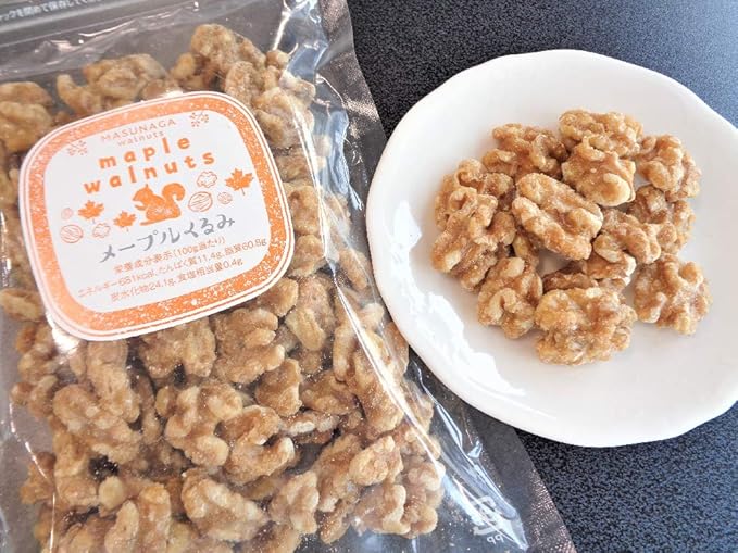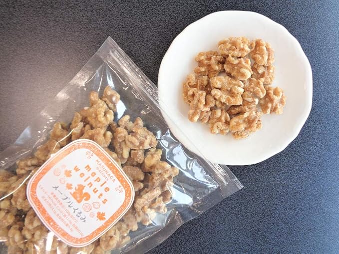 原材料:くるみ(米国)、砂糖、メープルシロップ、麦芽糖、水飴、しょうゆ、食塩、しょうが、(一部に小麦・くるみ・大豆を含む)