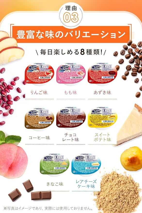 【飲み込みのしやすさに配慮】 かむ力や飲み込む力が気になる方にも配慮したハイカロリーゼリーです。 舌でつぶせる程度のやわらかさで、飲み込みもしやすいため、年齢を重ねた方や、在宅での介護でも使用されています。