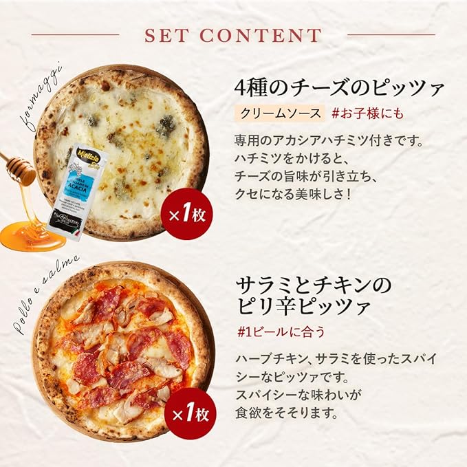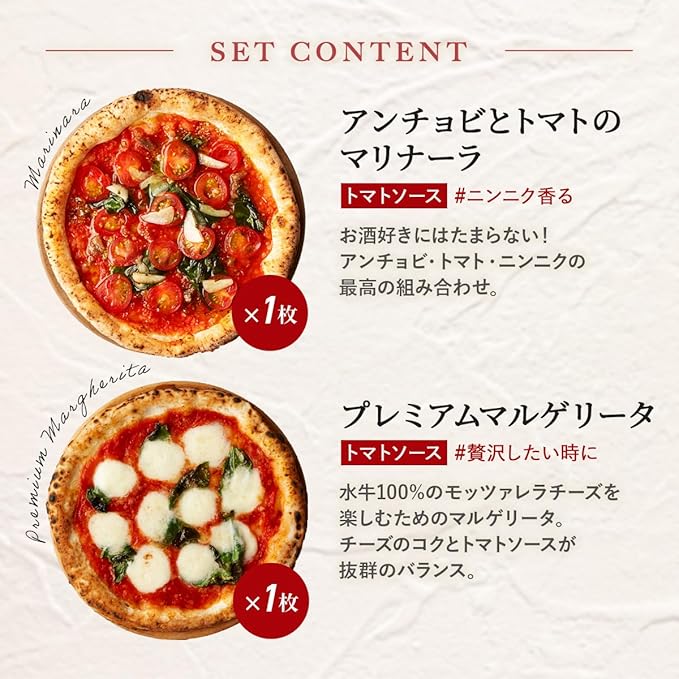 原材料:■アンチョビとトマトのマリナーラ:ピザ生地(小麦粉(国内製造)、食塩、パン酵母)、トマトソース、ミニトマト、アンチョビ、食用調合油、オリーブ油、にんにく、バジル、食塩、オレガノ / クエン酸、(一部に小麦を含む)■ サラミとチキンのピリ辛ピッツァ:ピザ生地(小麦粉(