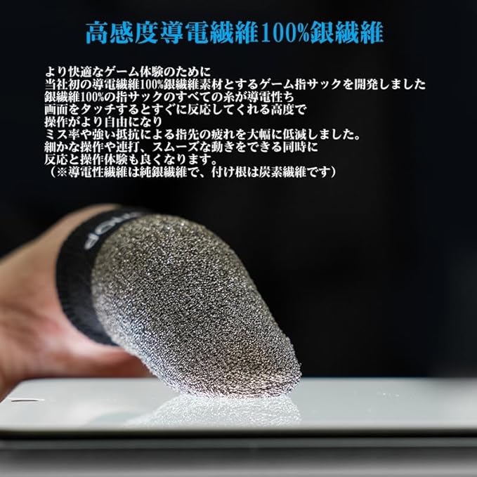 【高感度導電繊維100%銀繊維】 より快適なゲーム体験のために、当社初の導電繊維100%銀繊維素材とするゲーム指サックを開発しました。銀繊維100%の指サックのすべての糸が導電性を持ち、画面をタッチするとすぐに反応してくれる高感度で、操作がより自由になり、ミス率や強い抵抗による指先の疲れを大幅に低減しました。 細かな操作や連打、スムーズな動きをできる同時に、反応と操作体験も良くなります。(※導電性繊維は純銀繊維で、付け根は炭素繊維です)