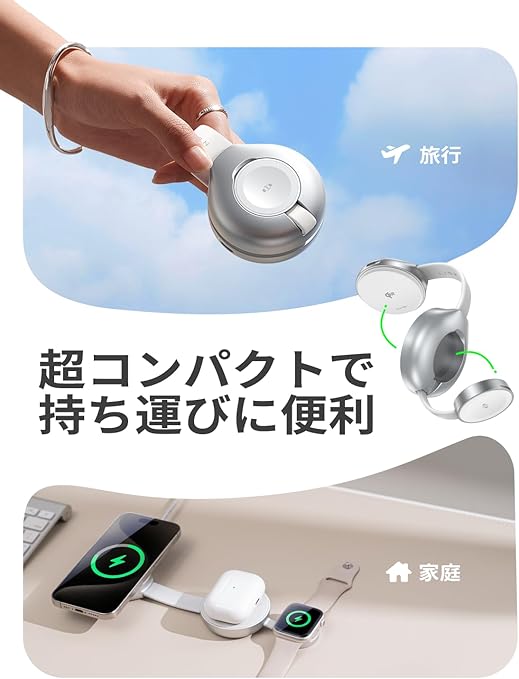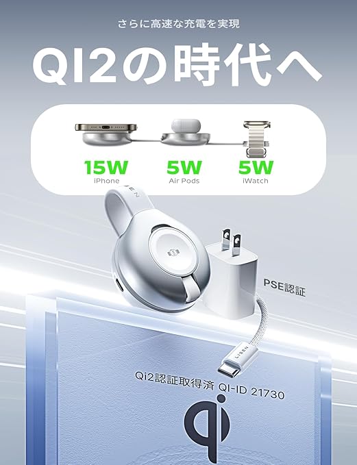 QI2認証のQI-ID 21730 3in1 MagSafe充電器は、充電速度が1倍向上し、iPhone 16(15W)、アップルウォッチ 充電器(5W)、およびAirPods(5W)をサポートしています。スマートフォンと置き型充電器の間はわずか2mmの距離で充電可能で、同時に3台のデバイスに充電できます。家庭、オフィス、旅行、ホテル、会議室などで利用でき、ケーブルの煩わしさを解消し、スペースを節約し、信頼性の高い便利な充電体験を提供します。注意:高温環境での使用は避けてください。(注意:充電中