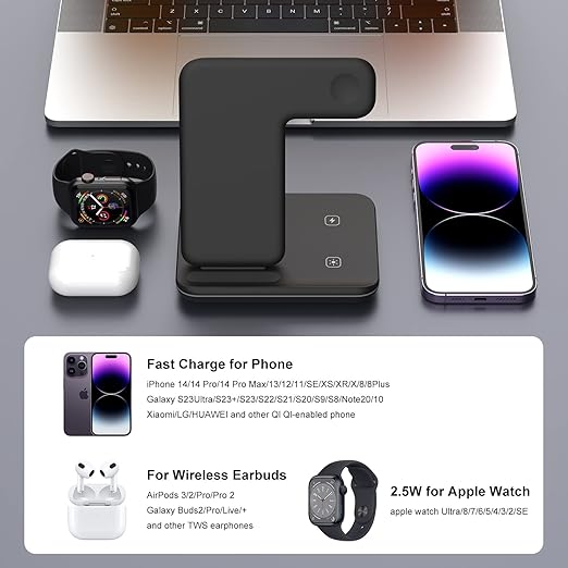 【2023新登場 3in1ワイアレス充電器】本製品は同時にスマホ、ヘッドフォン、ウオッチをワイヤレス充電できます。最大15W出力で、従来のワイヤレス充電器に比べ、充電スピードが2倍以上に速く、充電時間を大幅に短縮できます。ワイヤレス充電に対応するあらゆる機器と互換性があります。イヤホン:AirPods 3/ 2/ Pro/Pro 2/Galaxy BudsシリーズなどTWSに対応。Watch:Apple Watch 8/7/6/5/4/3/2/SEに対応。携帯:iPhone14/13/12/11