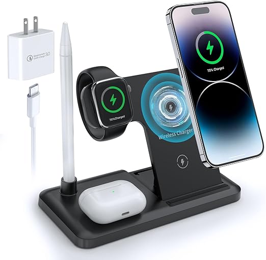 【4 in 1多機能ワイヤレス充電器&置くだけで充電】Airpods,Apple Watch, Apple Pencil,またiPhoneを同時に充電可能のワイヤレス充電器を初登場しました。1台4役!配線多くて、お部屋を散乱の状態から解放。置くだけで、充電しながらチャットしたり、音楽を聞きたり、映画を見たりすることも楽しみます。または、ほとんどのスマホケースを付けるままに置くだけでスマートフォンを充電することが可能です。充電中に赤いLEDライトを点滅して、使い方はとても便利です。(※5mm以下の