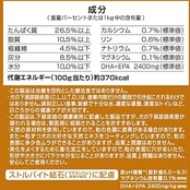 原材料:穀類(とうもろこし、コーングルテンミール)、肉類(ミートミール、チキンミール、チキンレバーパウダー)、豆類(おから、脱脂大豆)、油脂類(動物性油脂、フィッシュオイル:DHA・EPA源)、魚介類(フィッシュミール)、糖類(フラクトオリゴ糖)、セルロース、セレン酵母、シャンピニオンエキス、ビタミン類(A、D3、E、K3、B1、B2、パントテン酸、ナイアシン、B6、葉酸、ビオチン、B12、C、コリン)、ミネラル類(カルシウム、リン、ナトリウム、カリウム、塩素、鉄、コバルト、銅、マ