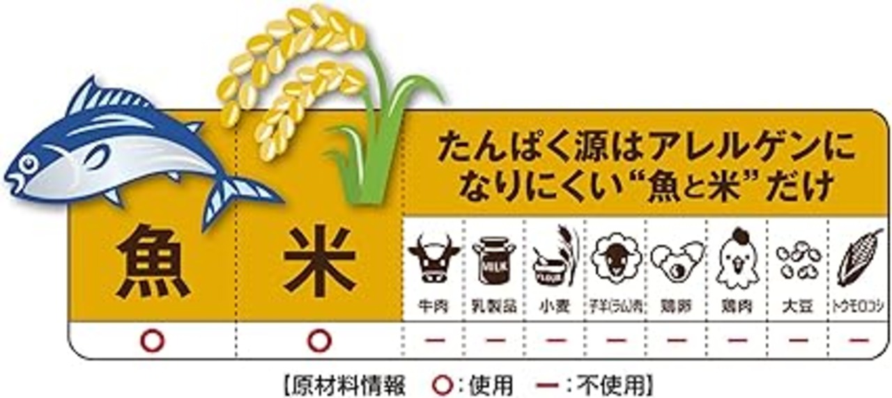 原材料:魚介類(まぐろ、フィッシュエキス、マリンコラーゲン)、穀類(米、米粉)、油脂類(植物性油脂、魚油:DHA・EPA源)、ビタミンE、増粘多糖類
