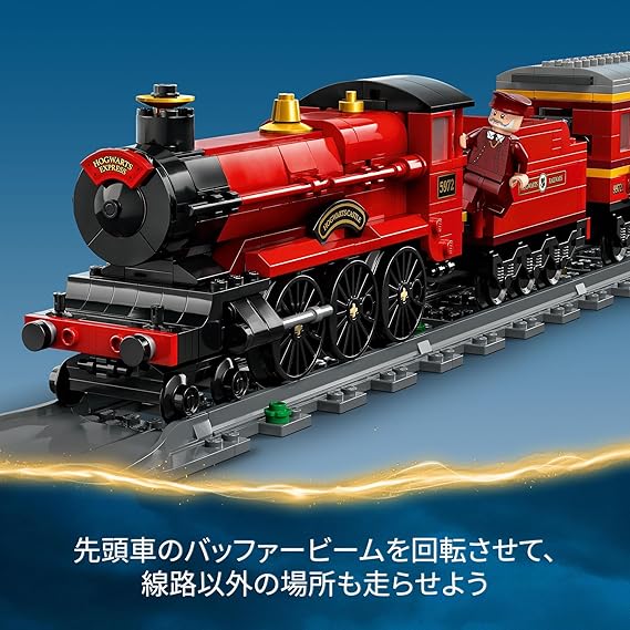 ホグワーツ特急と線路 – 機関車・石炭車・客車2台が連結したホグワーツ特急(車内販売の台車付き)を組み立てよう。先頭車のバッファービー