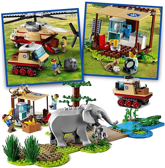 ウィンチ付きヘリコプター、キャタピラ車、動物病院、地滑り機能が付いた沼地のミニモデルの組み立てに必要なパーツ、ゾウの親子、ヘビ、サルのフィギュアとミニフィグ4体、各種アクセサリーのセットです。
