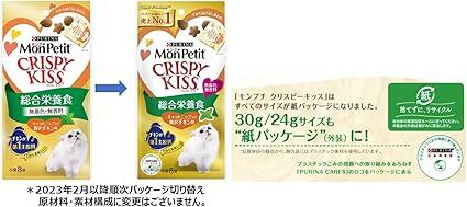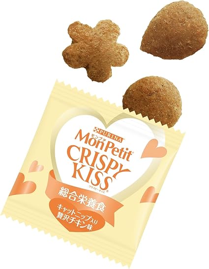 人気のモンプチ クリスピーキッスからネコちゃんに必要な栄養をバランスよく配合した総合栄養食登場。チキンが第一主原料でネコちゃんが夢中になる美味しさ。キャットニップ配合。美味しくかんでストレスケアにも。無着色無香料。